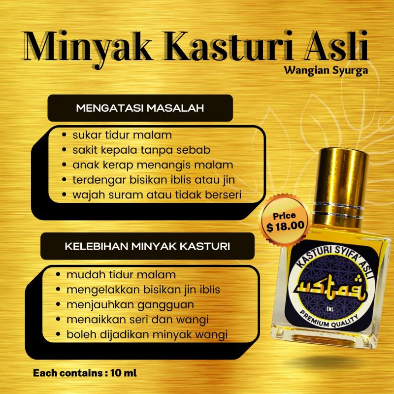 Minyak attar kasturi boleh digunakan utk membuang setan yg dok bergayut dlm badan kita. Sebaik-baik wangian adalah minyak kasturi hadith riwayat Muslim Di dalam kitab perubatan Islam berbahasa. Minyak wangi kasturi putih asli kasturi putih original minyak sholat.
